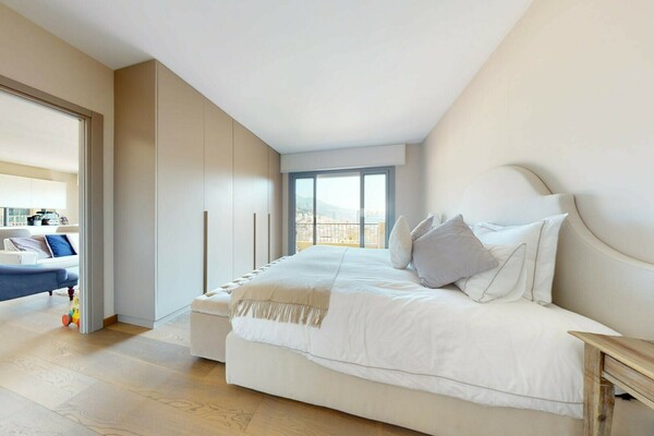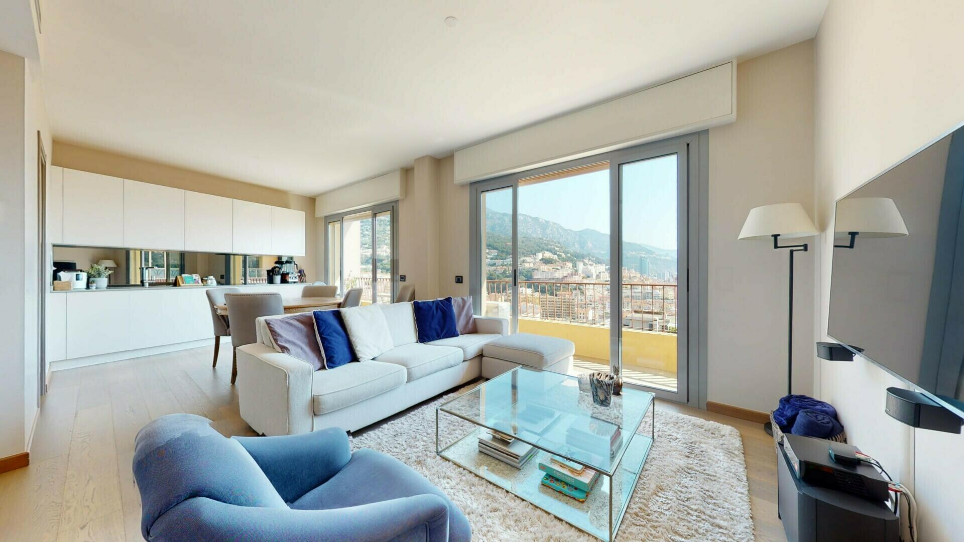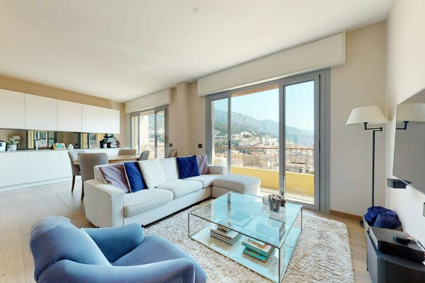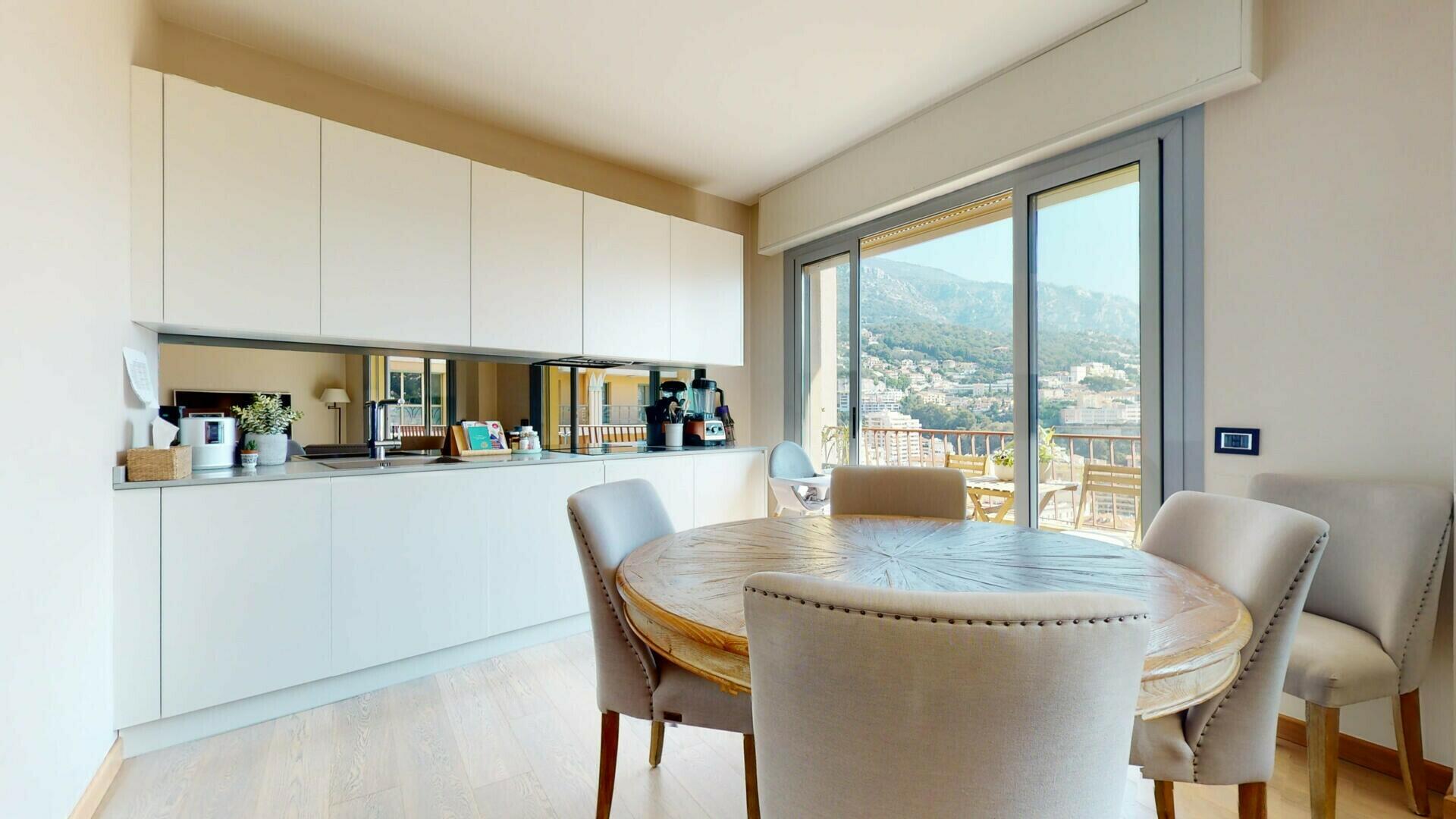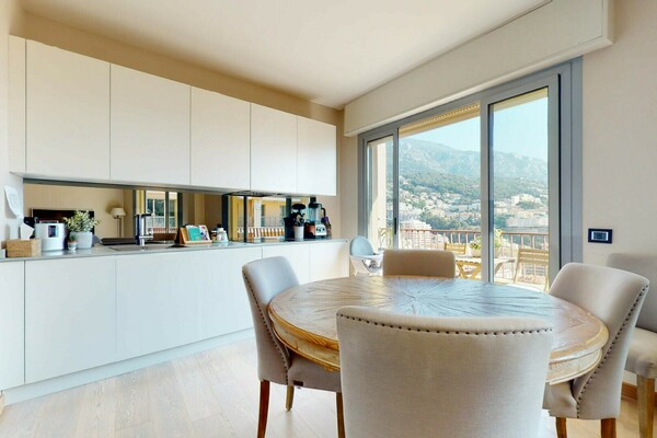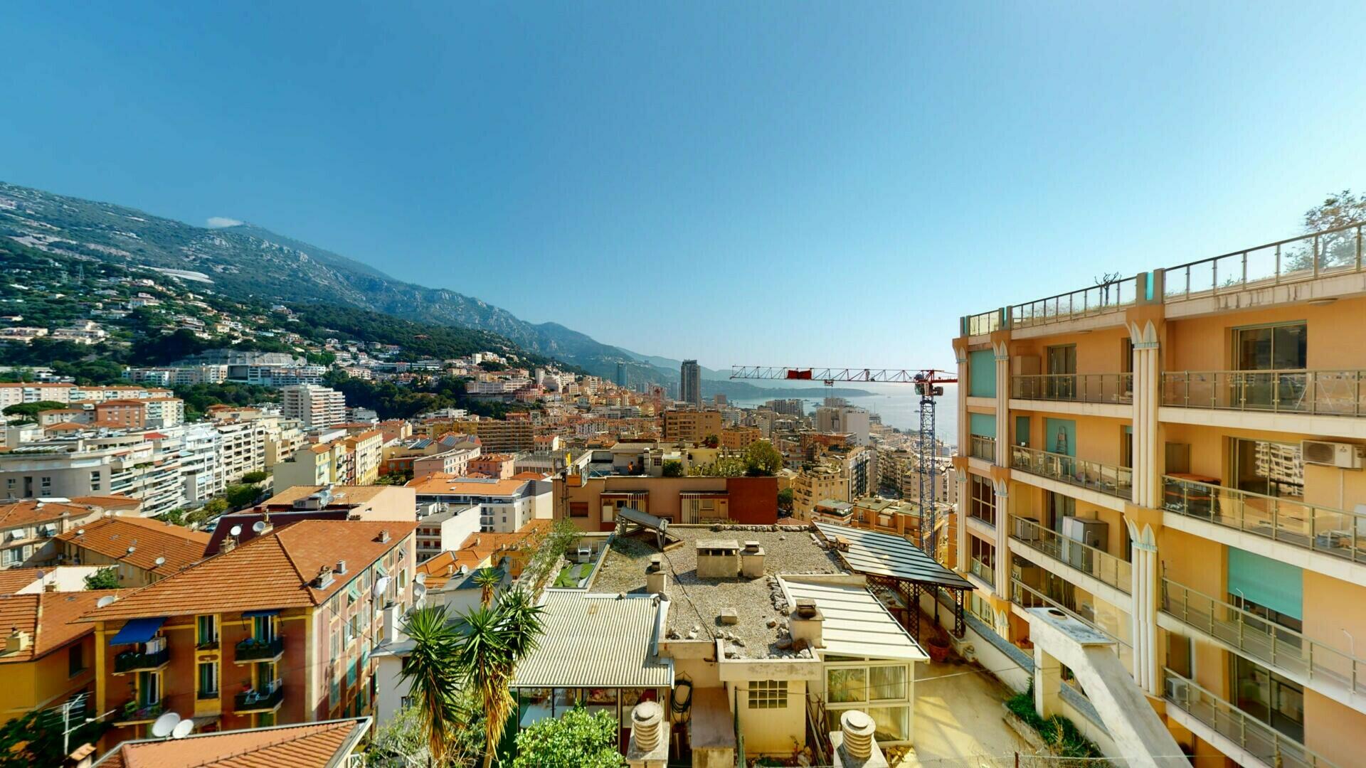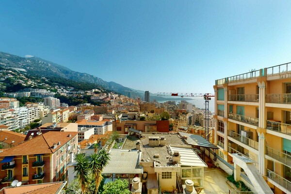Ce lumineux et spacieux appartement est situé dans le quartier du Jardin Exotique, à proximité des commerces et à quelques minutes à pieds du Port par ascenseur.