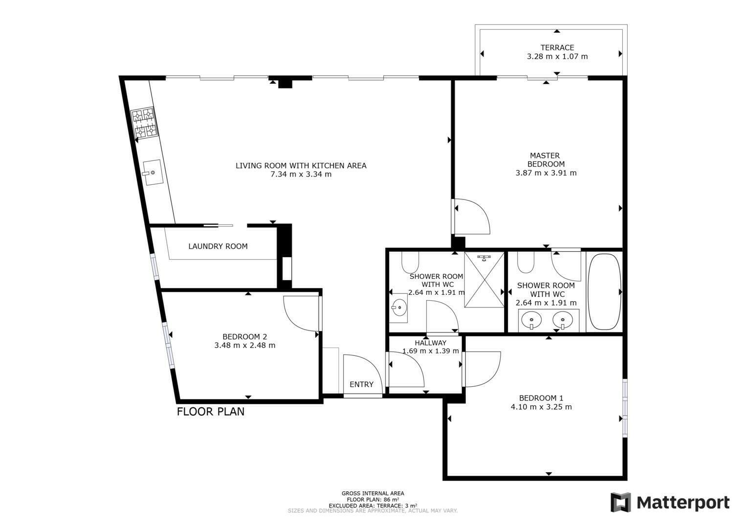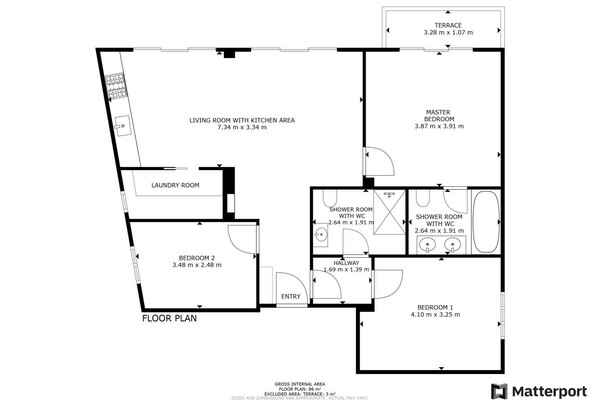Cet appartement de 4 pièces est composé d'une belle entrée menant au salon/salle à manger, une cuisine ouverte entièrement équipée et une buanderie, une chambre de maitre avec sa salle de bains, une chambre en suite avec salle de douche et une troisième chambre.